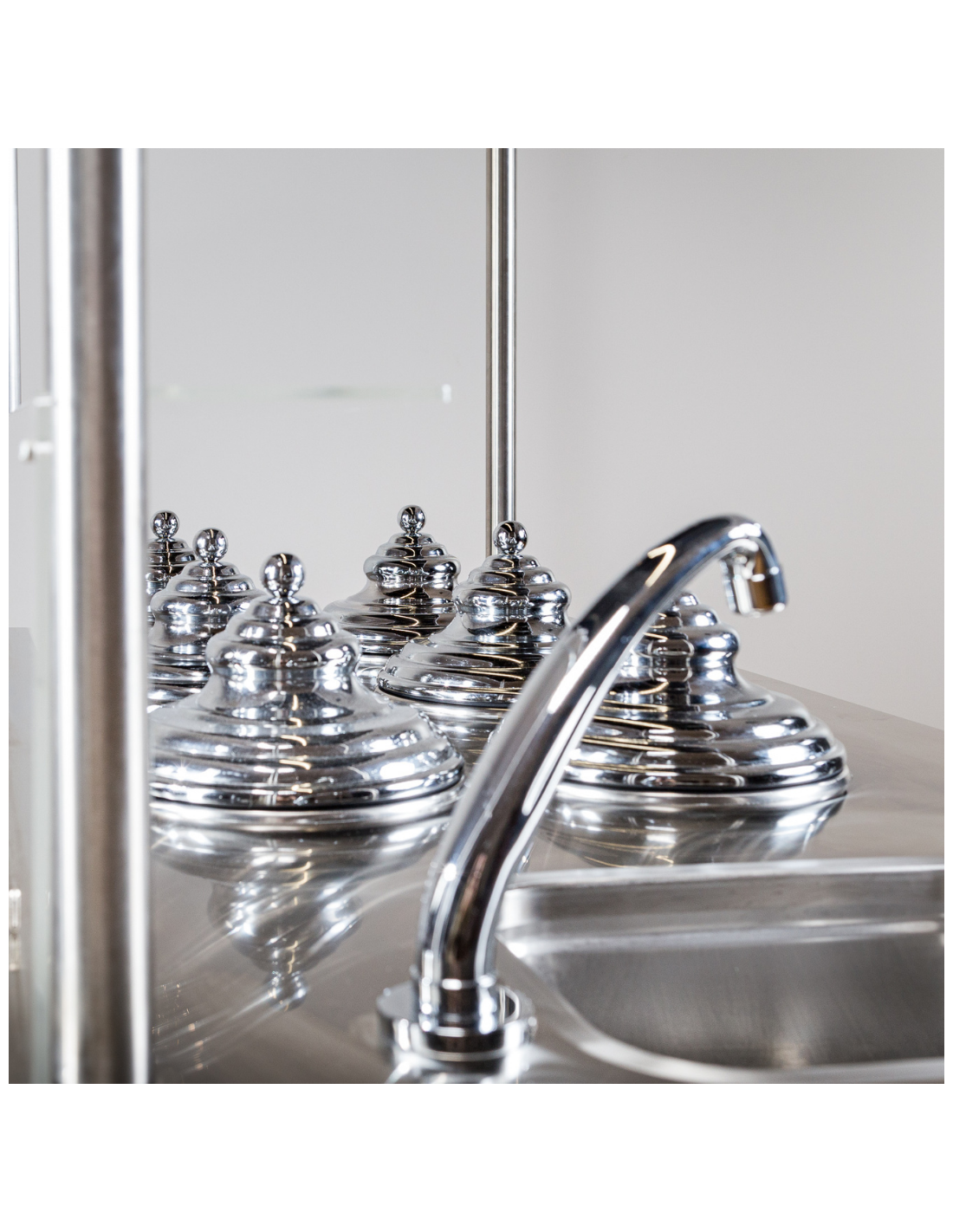 Encimera aislada de acero inoxidable con 6 compartimentos para helado, incluyendo 4 reservas adicionales en el estante inferior.