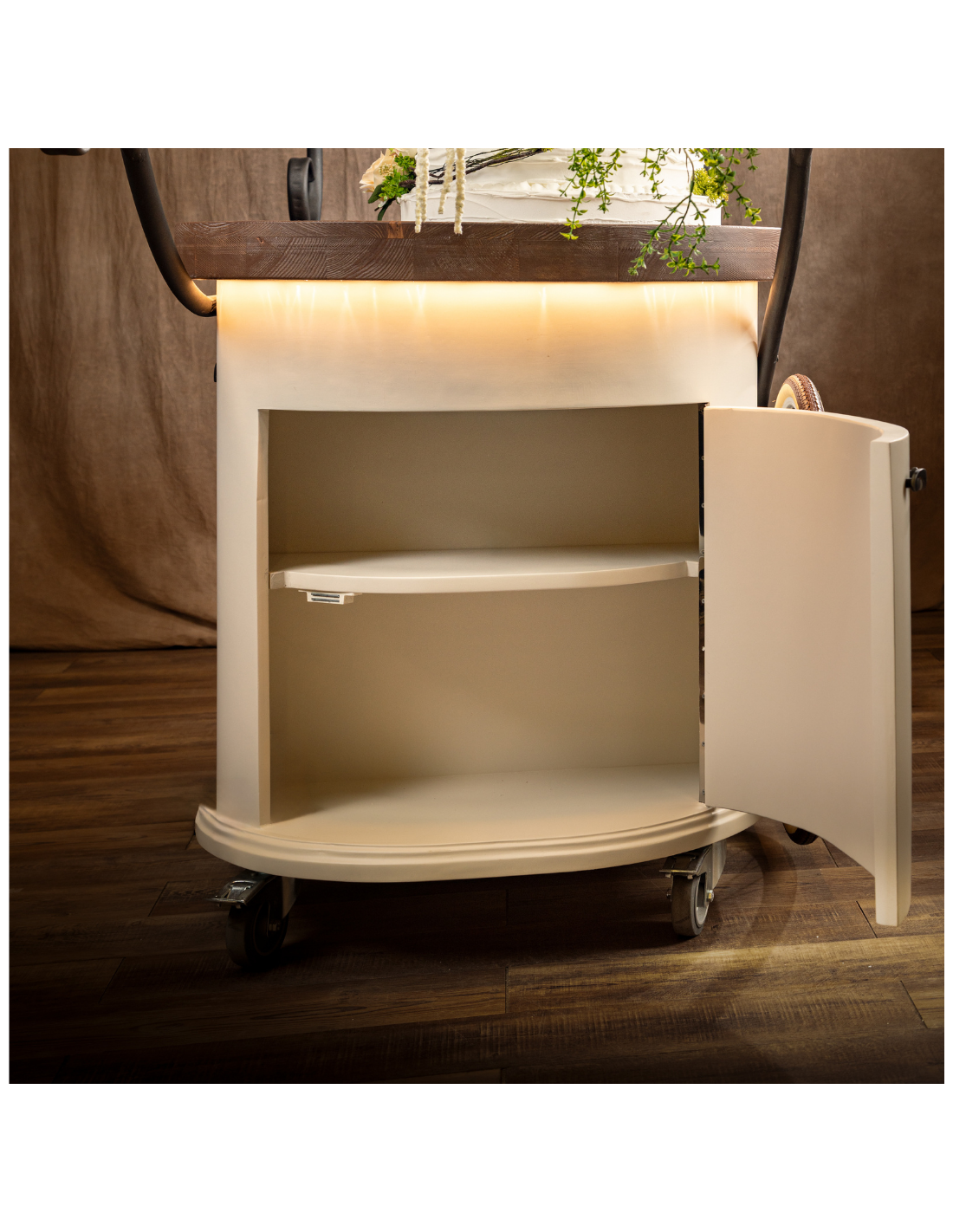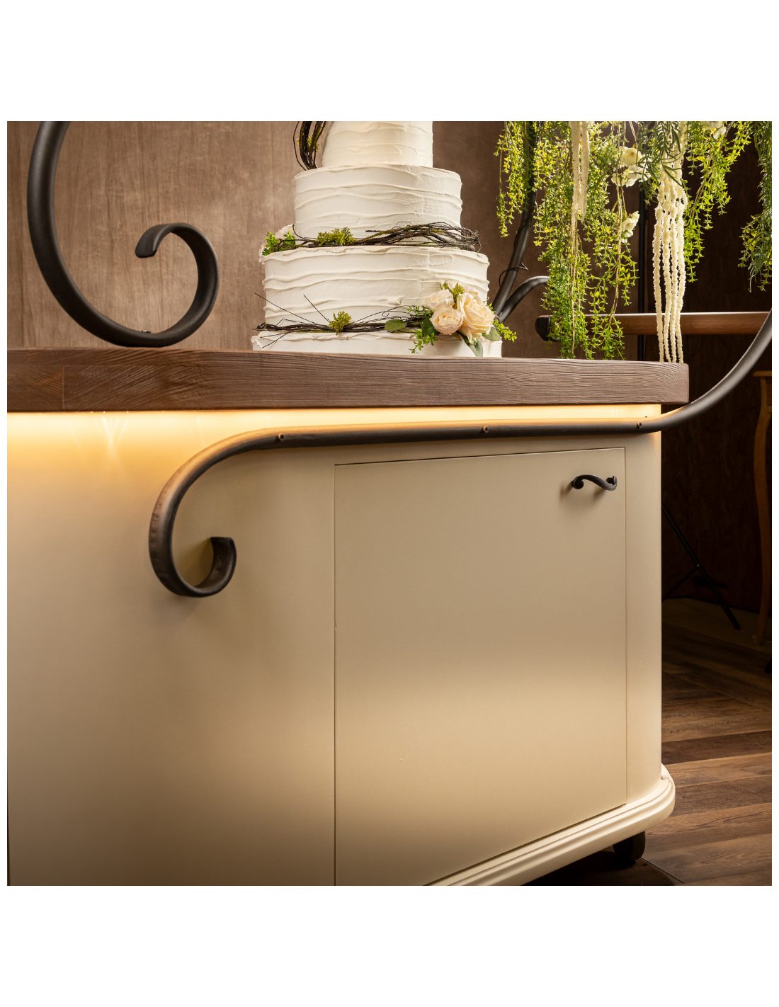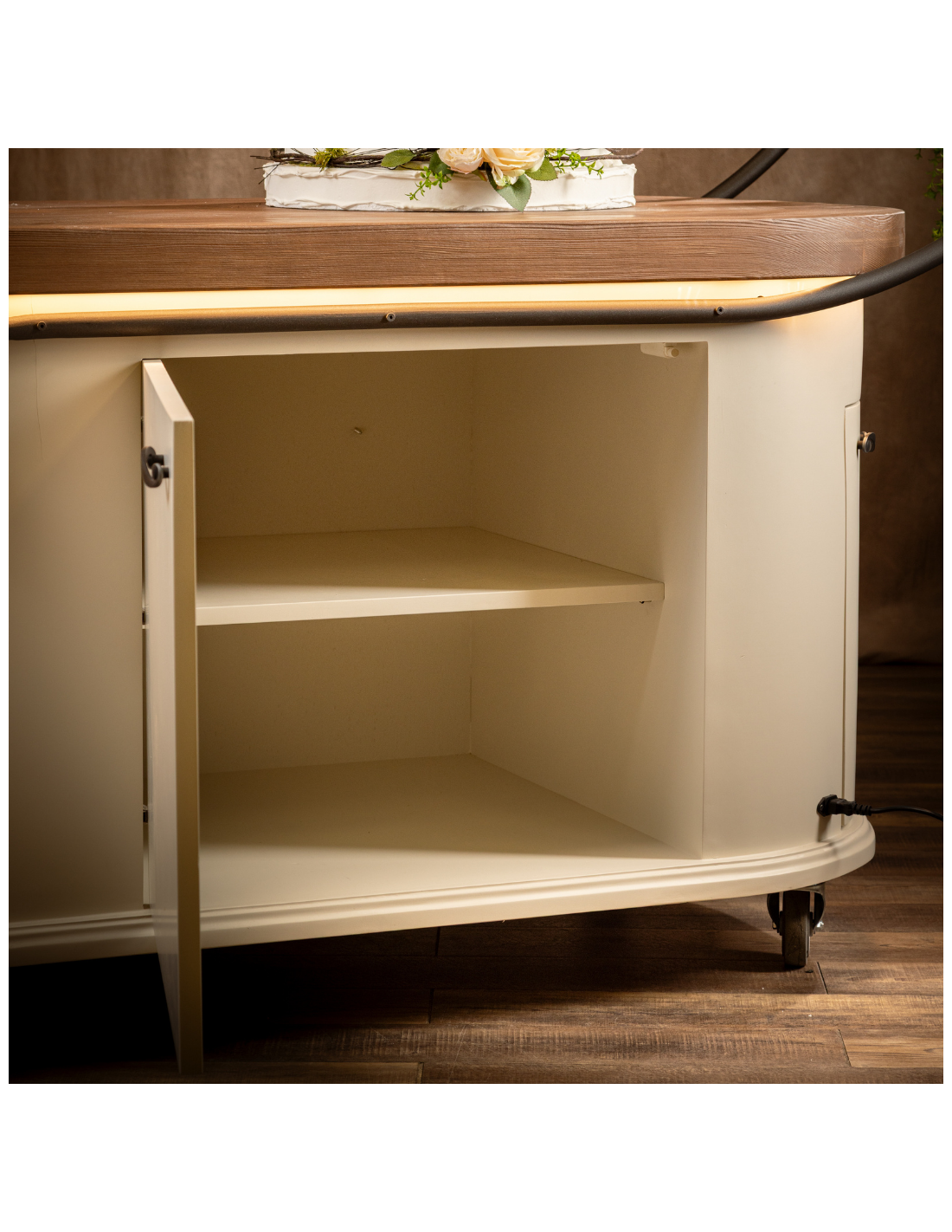 Encimera redondeada de madera de abeto con iluminación LED de 3000 K en todo el perímetro del borde exterior.